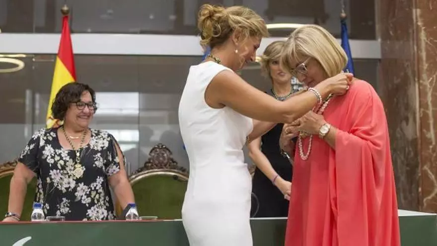 La alcaldesa, Amparo Marco, entregando la medalla a la directora del Ribalta, Paloma Segura, en un salón completamente abarrotado. / àngel sánchez/acf