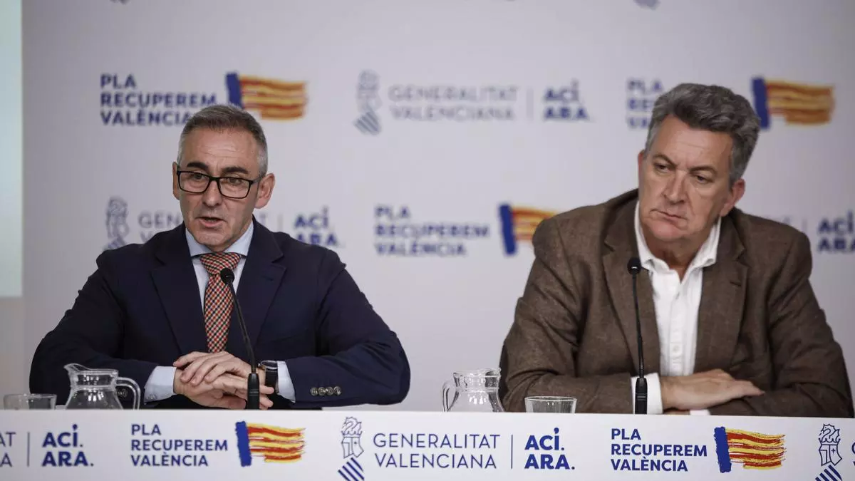 GRAFCVA1209. VALÈNCIA, 12/12/2025.- El portavoz del Consell, Miguel Barrachina, informa de los asuntos tratados en el pleno del Gobierno valenciano. En la imagen Barrachina (izqda), junto al vicepresidente 2º y conseller de Medio Ambiente, Infraestructuras y Territorio, Vicente Martínez Mus. EFE/Biel Aliño / Biel Aliño / EFE