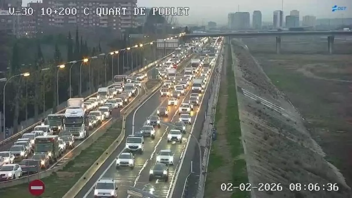 La V-30 registra otro accidente en el punto kilométrico 7.1 en sentido hacia la A-7 y acumula cinco kilómetros de congestión entre València y Mislata. También se encuentra congestionada con cinco kilómetros más en sentido contrario hacia el puerto, tres entre Quart de Poblet y Xirivella y dos en Paterna.