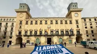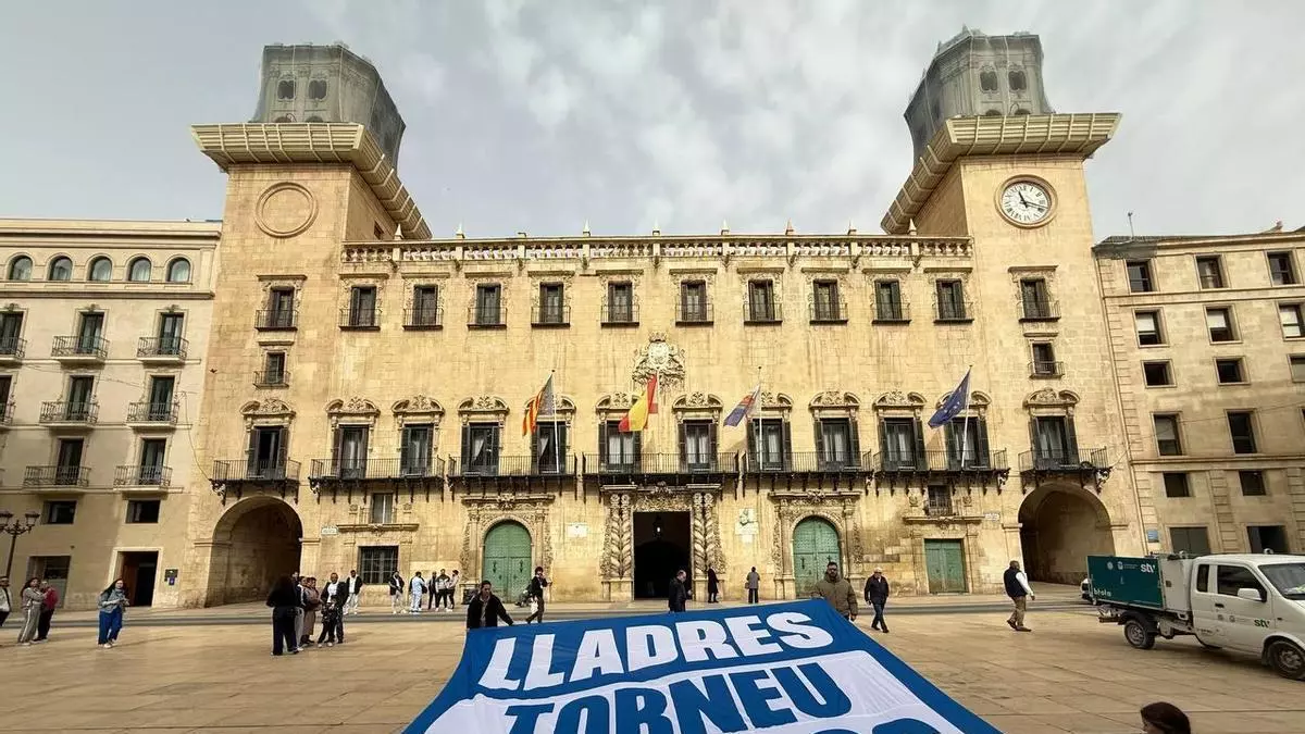 Pancarta extendida frente al Ayuntamiento de Alicante. / Levante-EMV