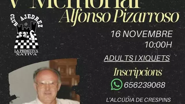 El pabellón de l’Alcúdia de Crespins acogerá el próximo 16 de noviembre el V Memorial Alfonso Pizarroso, un torneo organizado por el Club Ajedrez La Primitiva de Xàtiva en honor a quien fue fundador y presidente del club, “un apasionado del ajedrez que impulsó nuestro deporte a lo largo de toda su vida”, destacan.