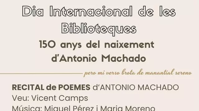 La Biblioteca Municipal de Xàtiva se sumará un año más a la celebración del Día Internacional de las Bibliotecas, que se conmemora cada 24 de octubre desde 1997 en recuerdo de la destrucción de la Biblioteca de Sarajevo, bombardeada la noche del 24 al 25 de agosto de 1992 durante la guerra de los Balcanes. Este año, aprovechando la conmemoración de los 150 años del nacimiento del poeta Antonio Machado, la Biblioteca Municipal de la capital de la Costera ha organizado un recital poético dedicado a su figura y obra. El acto tendrá lugar el jueves 23 de octubre a las 19:30 horas, en la sala de personas adultas de la propia biblioteca.