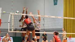 Bloqueo del Xàtiva Voleibol femenino en el partido. / Club Voleibol Xàtiva