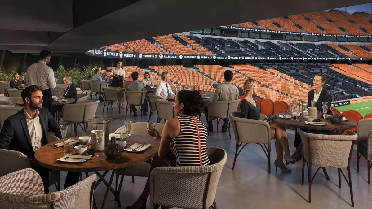 Simulación de una terraza del futuro restaurante con vistas al Nou Mestalla / VCF