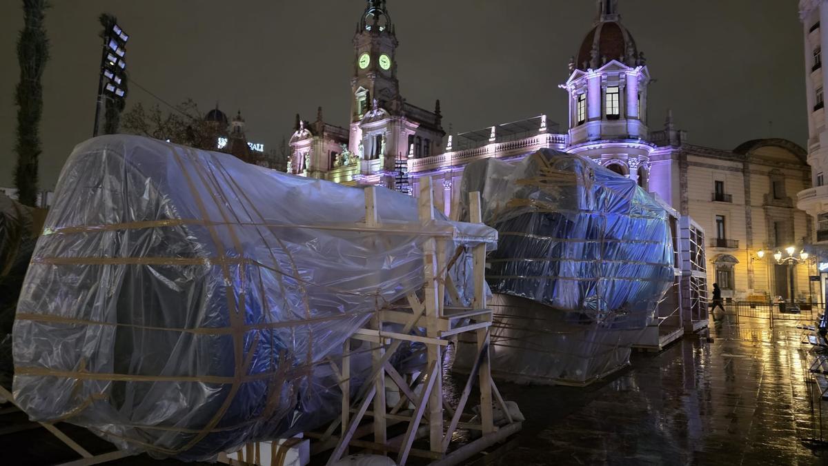 Llegan las primeras piezas de la falla municipal a la plaza del Ayuntamiento / Moisés Domínguez