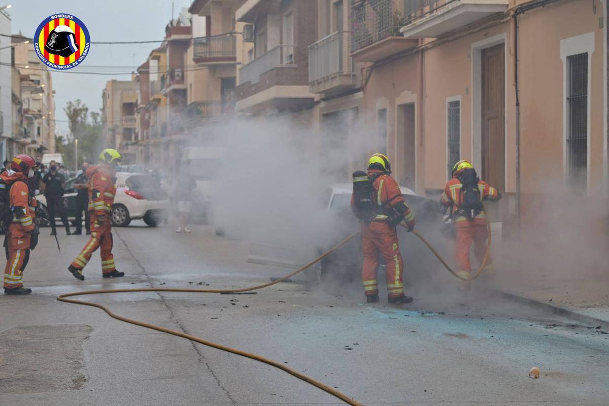 Los bomberos apagan un vehículo incendiado en plena calle en Carlet