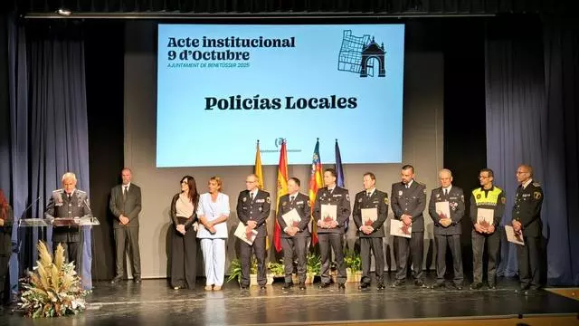Policías Localees reciben una distición en el acto institucional del 9 d'Octubre en Benetússer. / A. B.