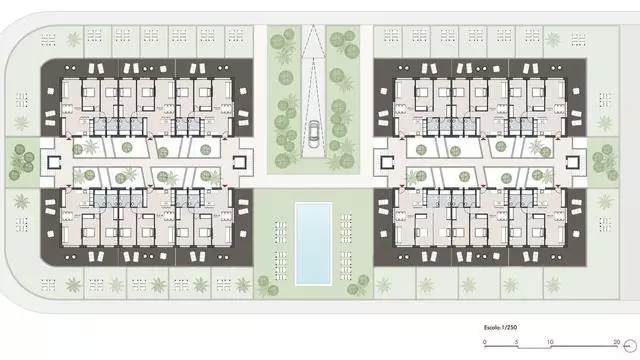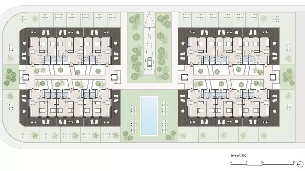 El tamaño de las viviendas hacía temer que las promociones serían un mazacote de pisos apiñados. Pero, sobre plano, se ve otra cosa. Los jardines dan aire. La piscina es, quizá, una rareza en las promociones de vivienda pública. Pero puede que resulte cada vez más imprescindible para combatir las severas olas de calor. Y Xàbia es el pueblo de la Comunitat Valenciana con más piscinas, nada menos que 9.275.