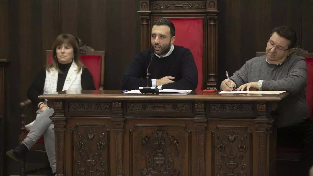 La concejala de Patrimonio de Sagunt, María José Carrera, junto al alcalde, Darío Moreno, y el secretario, durante un reciente pleno. / Daniel Tortajada