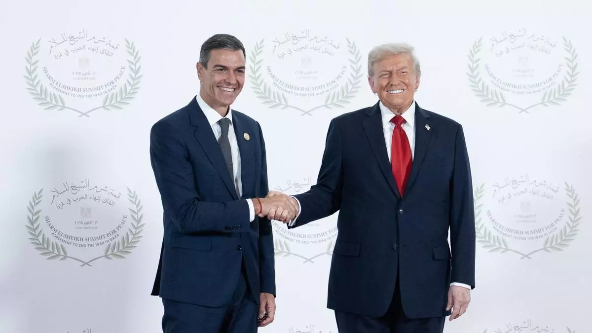 13/10/2025 El presidente del Gobierno, Pedro Sánchez (i) saluda al presidente de Estados Unidos, Donald Trump (d), antes de la ceremonia de firma del plan de paz para Oriente Próximo, a 13 de octubre de 2025, en Egipto. POLITICA Pool Moncloa/Borja Puig de la Bellacasa / Pool Moncloa/Borja Puig de la Be / Europa Press