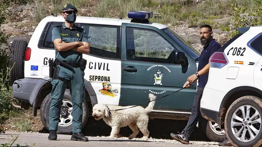 Seis agentes de la UCO, desplazados desde Madrid, y uno de Homicidios de València, acompañados por el guía de Junco, un perro de aguas español de dos años especializado en la detección de restos biológicos y huesos humanos y por agentes del Seprona que habían participado en la selección de áreas en esa zona, revisaron desde primeras horas de ayer tres de esos puntos, para fijar dónde buscar y con qué medios.