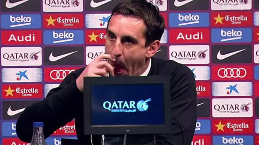 Dolido por el fracaso e incómodo. Así se siente Gary Neville. O al menos eso es lo que se desprende de su comunicación no verbal. Según Sonia El Hakim, analista y formadora en comunicación no verbal científica „autora de un blog en el diario Información„, los gestos del entrenador del Valencia CF en la rueda de prensa posterior a la goleada ante el Barça (7-0), indican que el técnico inglés se siente más «solo que un poeta en el aeropuerto», que canta Joaquín Sabina.