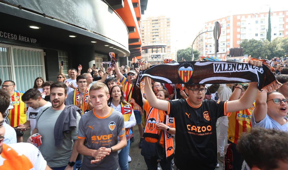 La afición valencianista ha recibido a los jugadores del Valencia CF entre vítores a su llegada a Mestalla. Los nervios están a flor de piel esta tarde, cuando tiene lugar el partido entre el equipo de Rubén Baraja y el Valladolid.
