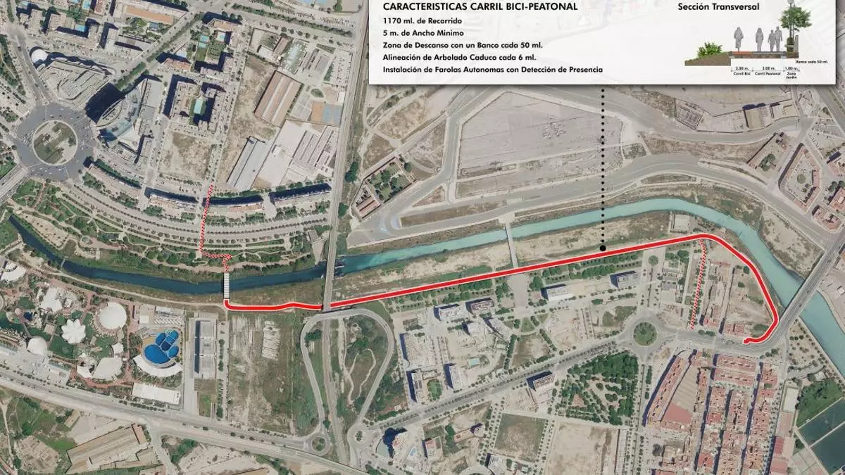 El trazado incluye una pasarela ligera que unirá la calle Tres de Abril de 1979 con el vial de servicio del CIP Centro de Investigación Príncipe Felipe, y que atravesará el puente de ferrocarril por su paso inferior, de forma que se mejorará y renaturalizará este espacio. El camino para ciclistas y peatones tiene una longitud prevista de 1,3 kilómetros y se han ampliado los diferentes anchos de carril. De forma genérica, la anchura será de 5 metros; en las zonas de arbolado será de 6 metros y en el tramo de la pasarela se reduce hasta los 4,5 metros. Está previsto que las obras concluyan a finales de 2026.