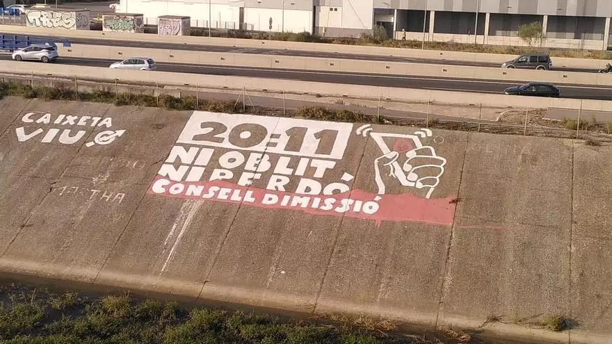 El mural apareció en la semana del aniversario de la barrancada. Mientras Mazón anunciaba su renuncia, dos operarios de la Generalitat taparon la parte donde se leía "Mazón dimissió". En la ladera del Plan Sur han repintado el mensaje "Consell dimissió" y aún puede verse el dibujo de un móvil con el lema "20.11. Ni oblit ni perdó"